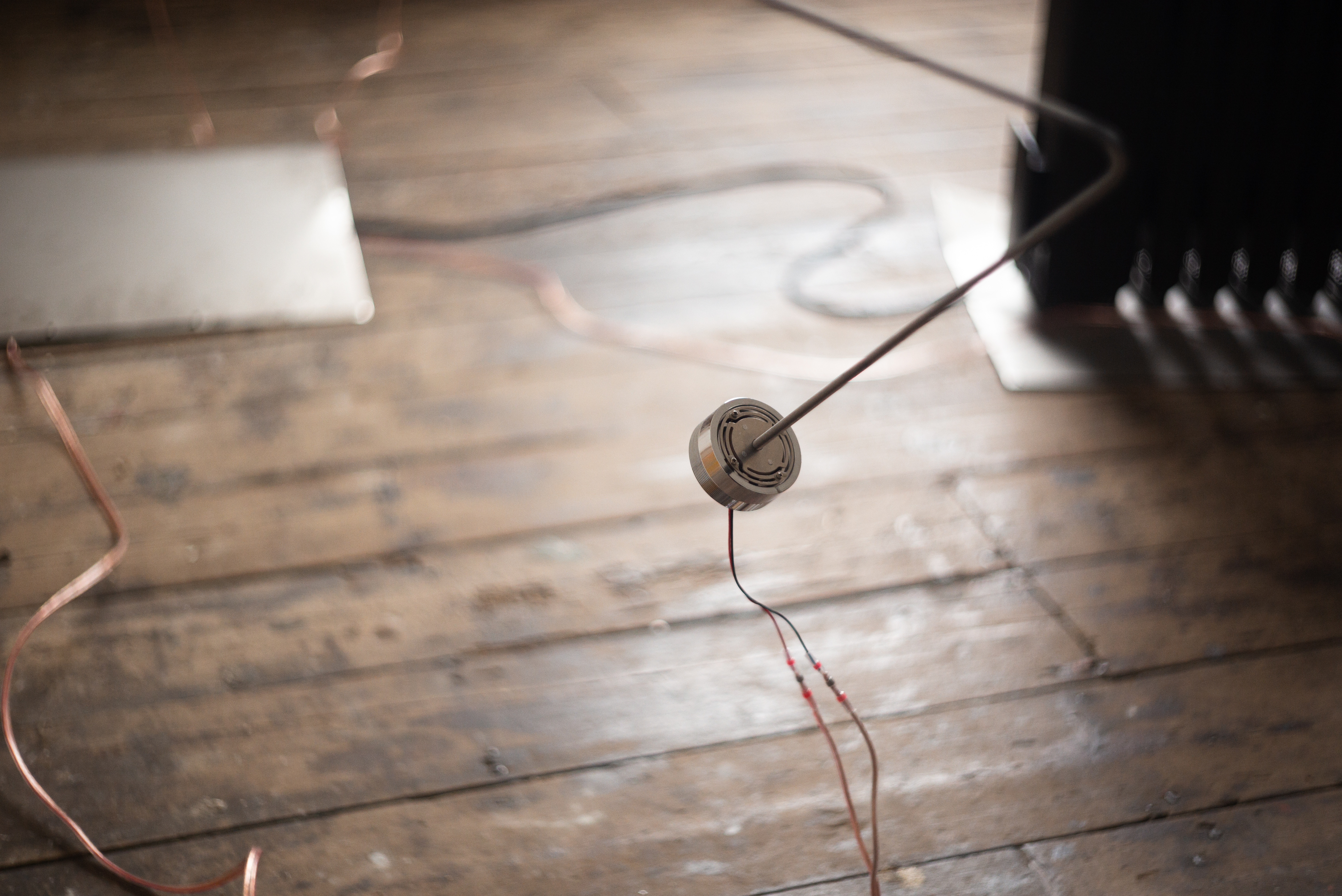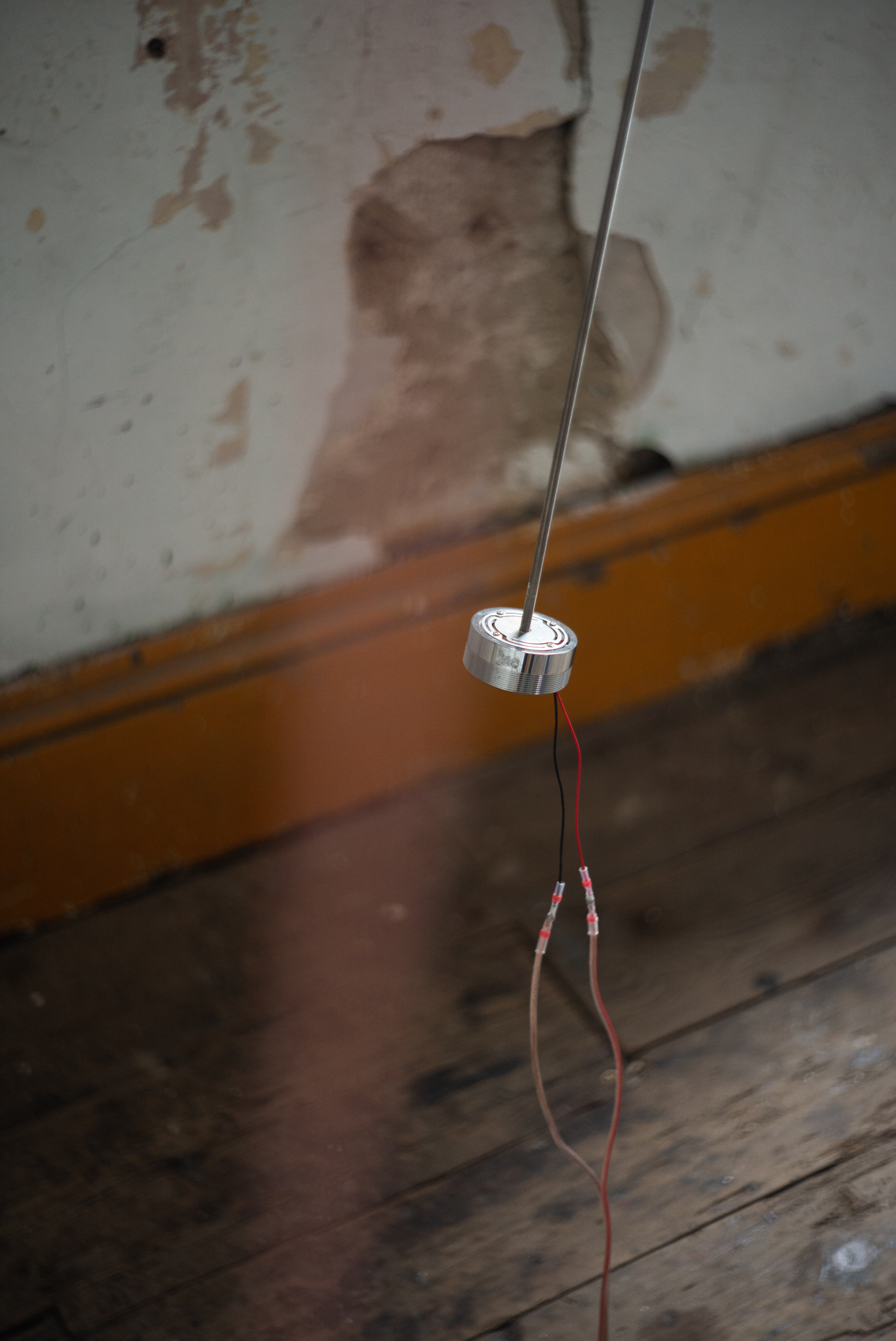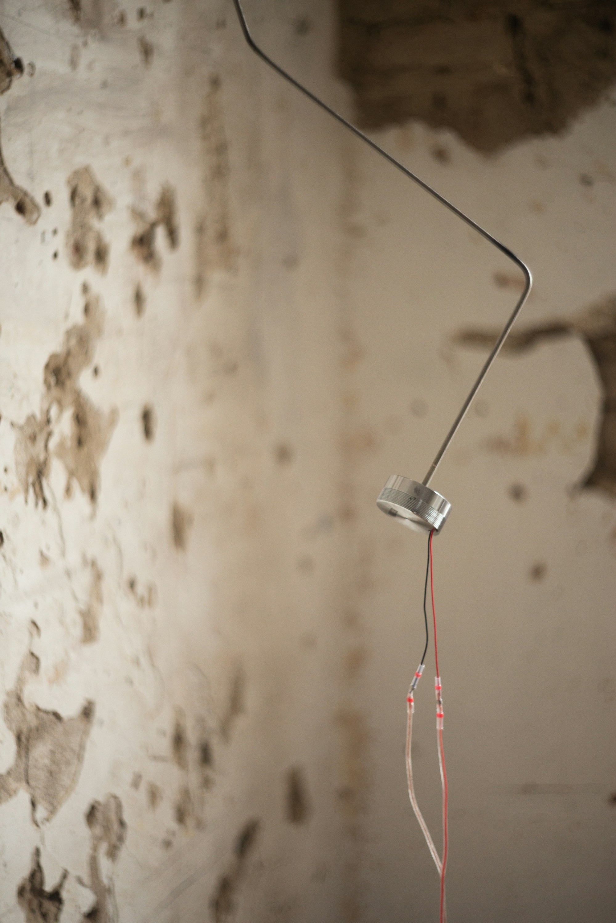 Stainless steel threaded bars connects sound transducers to existing holes in the exhibition wall. A low-frequency sine waves travel through the bars and enters the building’s structure, producing subtle vibrations that might be felt more than heard.