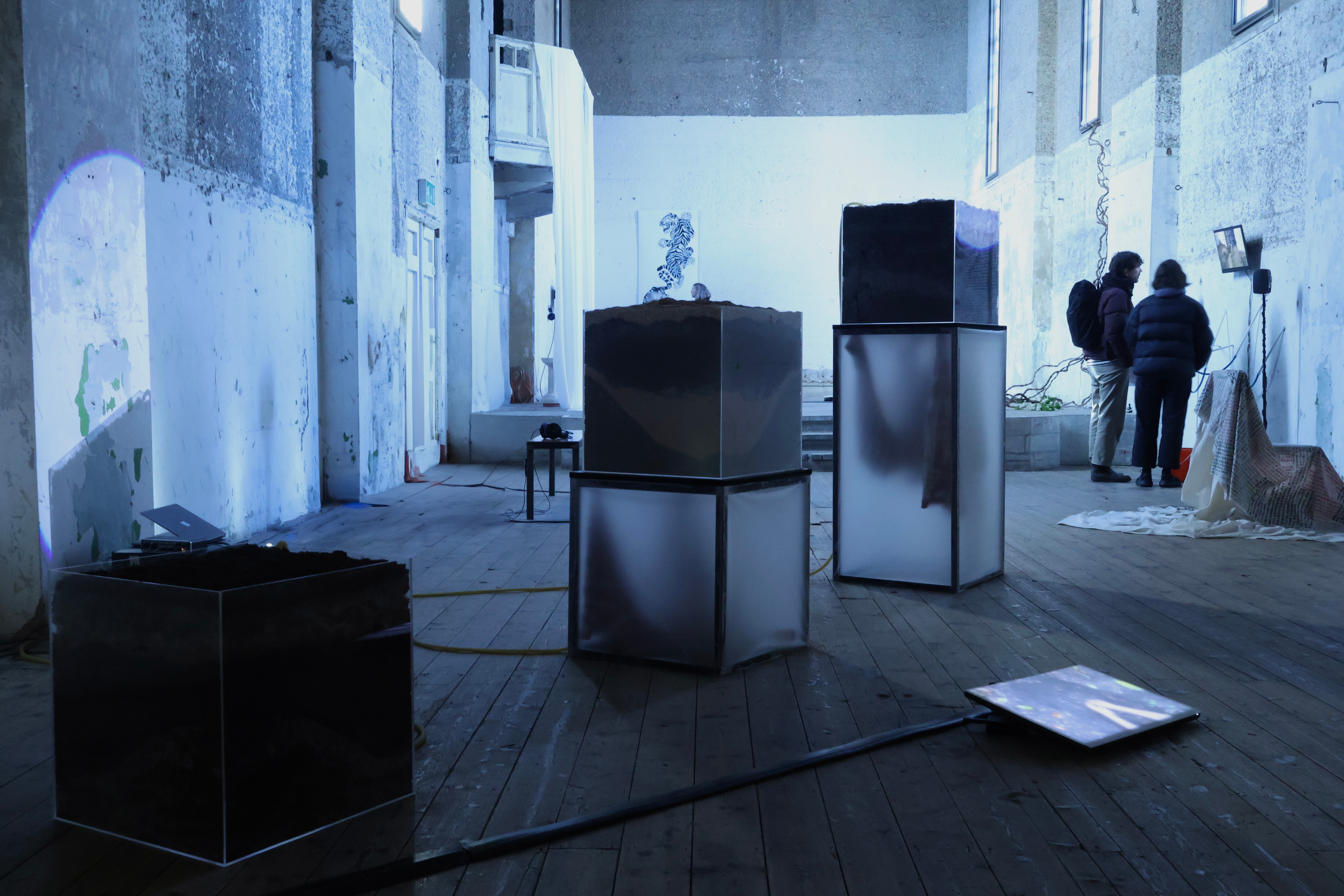 Three recorded sound materials of his grandmother are incorporated into the installation: breathing (6:44), talking (4:48), and singing (3:36). During the exhibition, these sounds continuously play within the soil, allowing the piece to function as a time-based sculpture where the metamorphosis of mourning is in motion.